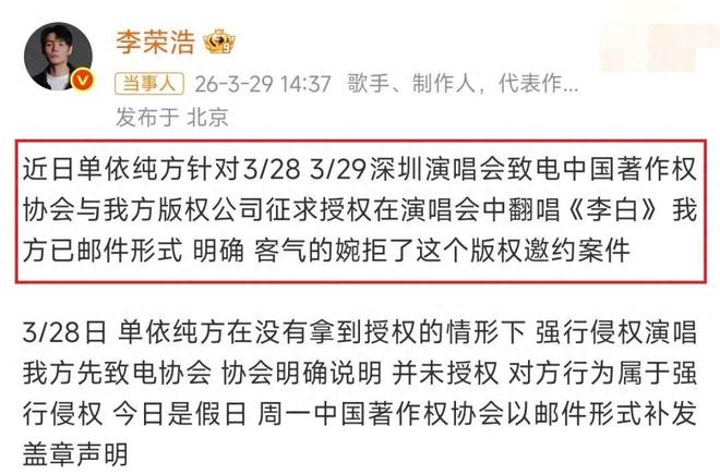 可是这回本来并没有翻唱的授权,之前单依纯方就向李荣浩申请过,可是被李荣浩真切的拒绝了。