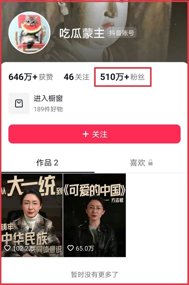 啥兴味?兴味是说,网上那么众人赞成吃瓜蒙主,但他们未必正在抖音上眷注吃瓜蒙主;吃瓜蒙主账号上510万众粉丝,但他们未必都是立体的人。